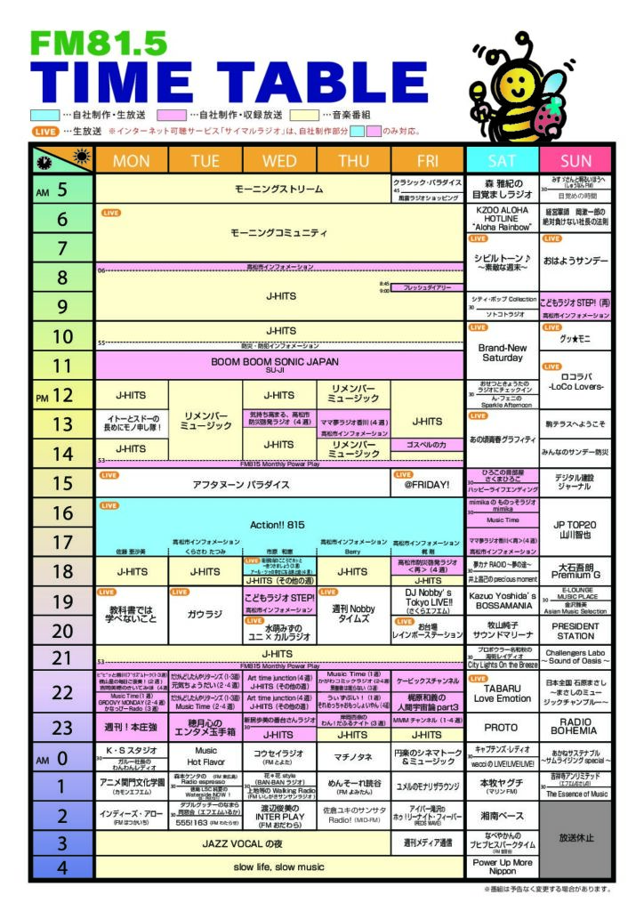 2025.10.1 タイムテーブル更新 2025.9.25 高松市防災啓発ラジオ9月放送分 2025.9.5 9/14「商店街軽音楽祭」開催♪ 2025.8.28 高松市防災啓発ラジオ8月放送 2025.8.22 8/24「第14回うどん県書道パフォーマンス大会」開催決定! 2025.8.15 8/16(土)ゆめタウン三豊店キッズダンスイベント! 2025.7.24 高松市防災啓発ラジオ7月分 2025.7.16 番台さんラジオ放送について 2025.6.27 高松市防災啓発ラジオ6月分 2025.6.1 高松市防災啓発ラジオ5月放送分